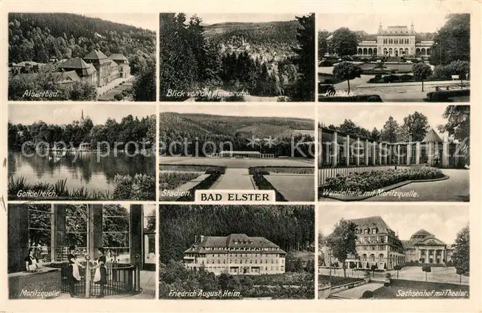 AK / Ansichtskarte Bad_Elster Albertbad Gondelteich Kurhaus Friedrich August Heim Theater Bad_Elster