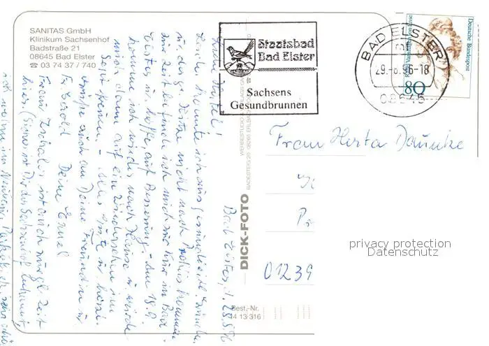 Bad_Elster Sanitas GmbH Klinikum Sachsenhof Bad_Elster postalisch gelaufen 1996 Erhaltung siehe scans [KathaD81] Kathoren