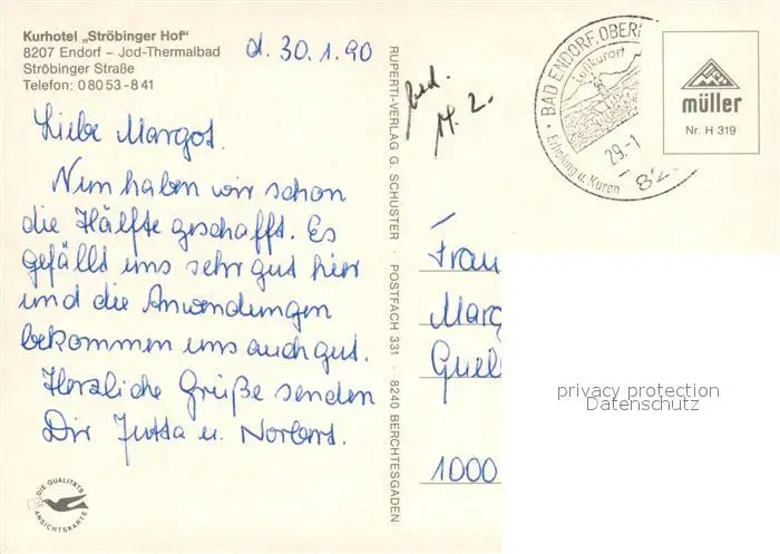 Bad_Endorf Kurhotel Stroebinger Hof Restaurant Ortsansicht mit Kirche Alpenblick Bad_Endorf postalisch gelaufen 1990 Erhaltung siehe scans [FriedD77] Frierer