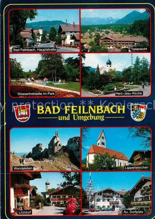 AK / Ansichtskarte Bad_Feilnbach Hauptstr Teilansicht Wassertretstelle im Park Herz Jesu Kirche Wendelstein Lippertskirchen Litzldorf Au Dorfplatz Bad_Feilnbach