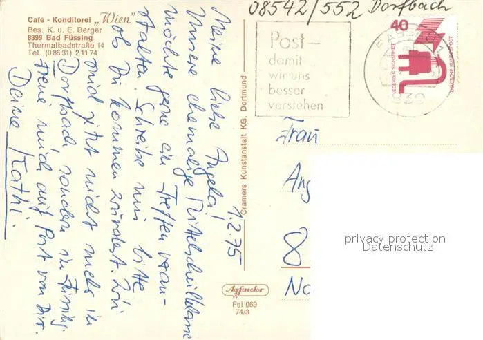 Bad_Fuessing Cafe Conditorei Wien Gaststube Bar Schwimmbad Bad_Fuessing postalisch gelaufen 1975 Erhaltung siehe scans [WerneD78] WernPID7