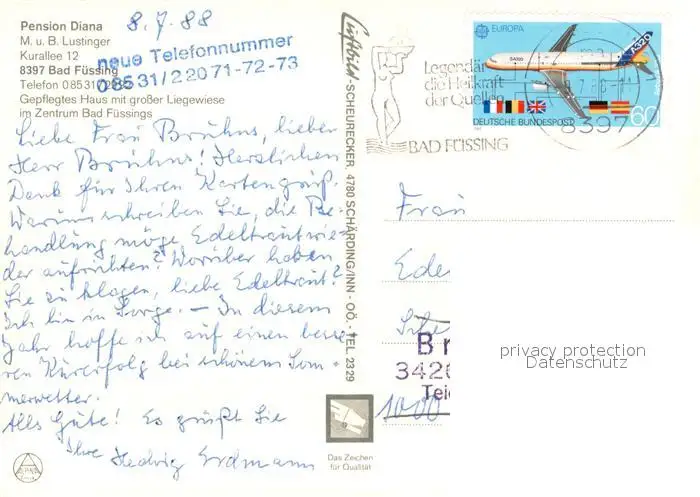 Bad_Fuessing Pension Diana Bad_Fuessing postalisch gelaufen 1988 Erhaltung siehe scans [FriedD77] Frierer