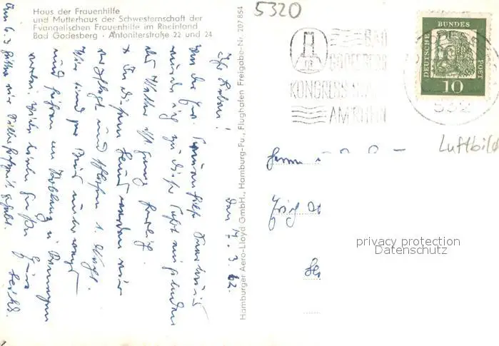 Bad_Godesberg Haus der Frauenhilfe und Mutterhaus der Schwesternschaft der Ev Frauenhilfe im Rheinland Fliegeraufnahme Bad_Godesberg postalisch gelaufen 1962 Erhaltung siehe scans [WerneD78] WernPID7