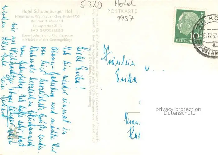Bad_Godesberg Hotel Schaumburger Hof Terrasse Blick ueber den Rhein Bad_Godesberg postalisch gelaufen 1957 Erhaltung siehe scans [FriedD77] Frierer