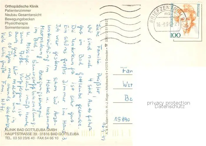 Bad_Gottleuba-Berggiesshuebel Orthopaedische Klinik Patientenzimmer Neubau Bewegungsbecken Physiotherapie Sonnenterrasse Bad postalisch gelaufen 1999 Erhaltung siehe scans [WerneD78] WernPID7