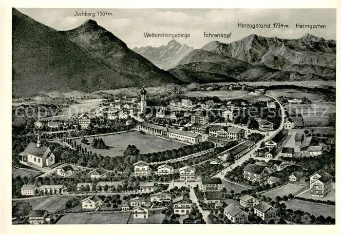 Bad_Heilbrunn Gesamtansicht aus der Vogelperspektive mit Jochberg Wettersteingebirge Fahrenkpf Herzogstand Heimgarten Bad_Heilbrunn postalisch nicht gelaufen 1921-1965 Erhaltung siehe scans [FriedD77] Frierer