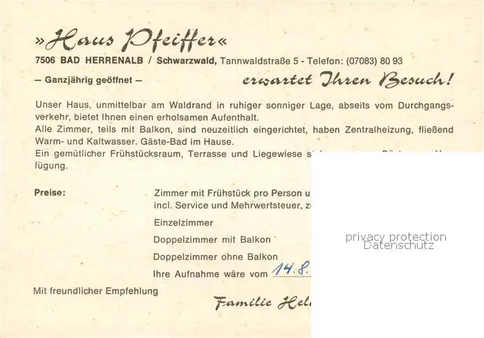 Bad_Herrenalb Haus Pfeiffer Bad_Herrenalb postalisch nicht gelaufen 1972 Werbekarte (keine Postkarte) Erhaltung siehe scans [WerneD78] Werbekarte (keine Postkarte) WernPID7