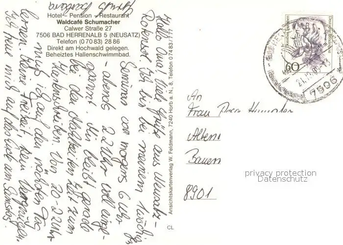 Bad_Herrenalb Waldcafe Schumacher Fliegeraufnahme Hallenbad Gaststube Bad_Herrenalb postalisch gelaufen 1989 Erhaltung siehe scans [WerneD78] WernPID7