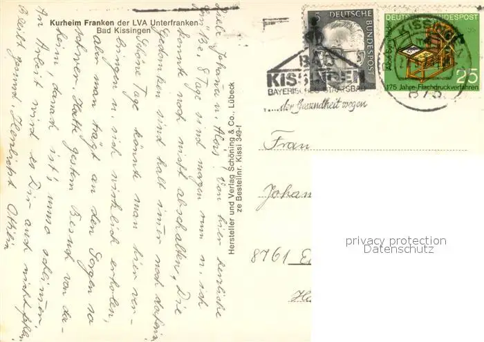 Bad_Kissingen Kurheim Franken der LVA Unterfranken Gastraeume Treppenaufgang Wasertreten Fontaene Postkutsche Bad_Kissingen postalisch gelaufen nach 1965 Erhaltung siehe scans [WerneD78] WernPID7