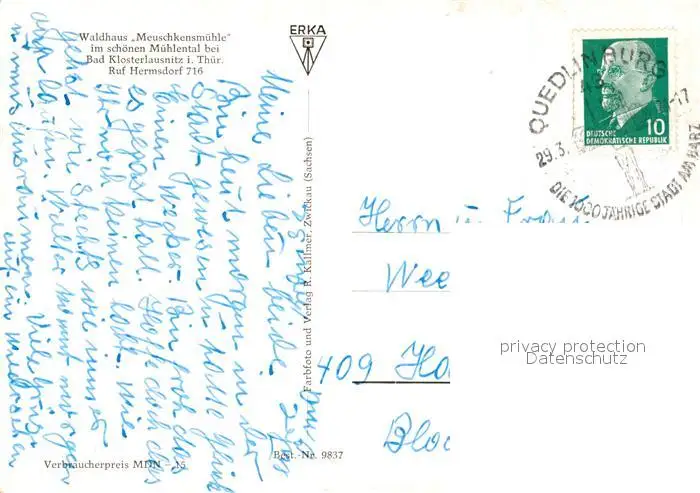 Bad_Klosterlausnitz Waldhaus Meuschkensmuehle Bad_Klosterlausnitz postalisch gelaufen 1967 Erhaltung siehe scans [FriedD77] Frierer