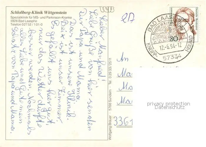 Bad_Laasphe Schlossberg Klinik Wittgenstein Bad_Laasphe postalisch gelaufen 1994 Erhaltung siehe scans [WerneD78] WernPID7