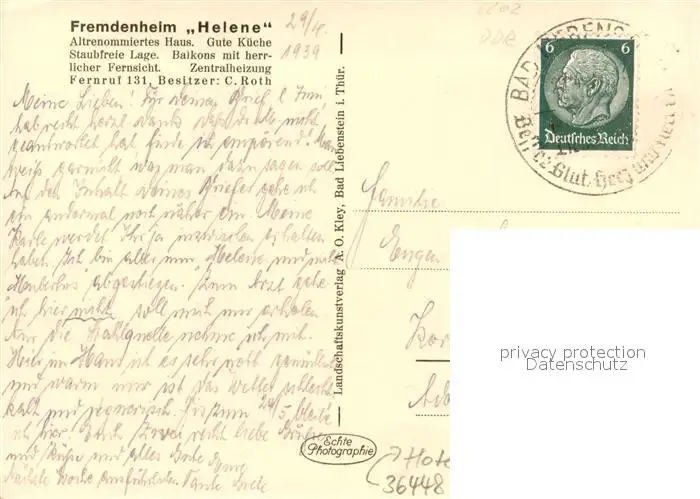 Bad_Liebenstein Fremdenheim Helene Bad_Liebenstein postalisch gelaufen 1939 Erhaltung siehe scans [WerneD78] WernPID7