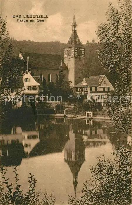 Bad_Liebenzell Partie am See Kirche Wasserspiegelung Kurort im Schwarzwald Bad_Liebenzell postalisch nicht gelaufen 1921-1965 Erhaltung siehe scans [FriedD77] Frierer