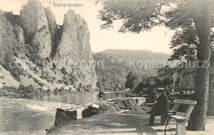 Bad_Muenster_Stein_Ebernburg Uferpartie an der Nahe Rheingrafenstein Felsen Bad_Muenster postalisch gelaufen 1908 Erhaltung siehe scans [FriedD77] Frierer