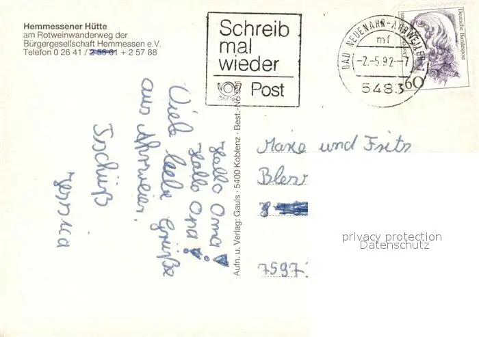 Bad_Neuenahr Ahrweiler Kategorie Alte Ansichtskarten Postkarten bx62359 Bad_Neuenahr Ahrweiler Hemmessener Huette Bad_Neuenahr Ahrweiler postalisch gelaufen 1992 Erhaltung siehe scans [KathaD81]