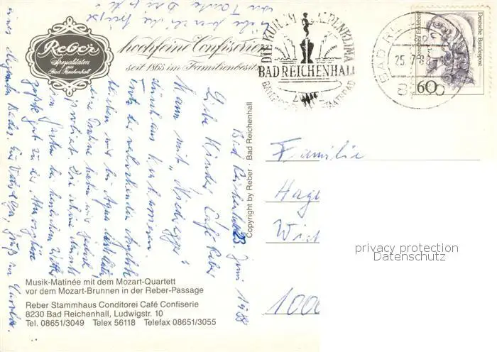 Bad_Reichenhall Musik Matinee mit dem Mozart Quartett vor dem Mozart Brunnen in der Reber Passage Bad_Reichenhall postalisch gelaufen 1988 Erhaltung siehe scans [WerneD78] WernPID7
