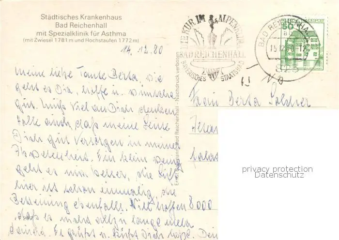 Bad_Reichenhall Staedt Krankenhaus mit Spezialklinik fuer Asthma Bad_Reichenhall postalisch gelaufen 1980 Erhaltung siehe scans [FriedD77] Frierer