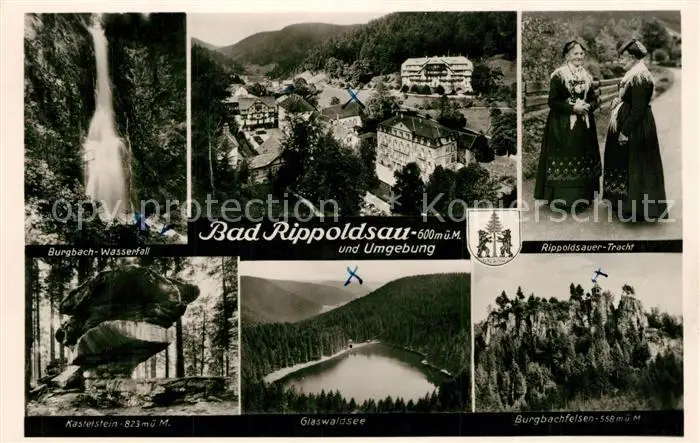 Bad_Rippoldsau_Schwarzwald Burgbach Wasserfall und Felsen Rippoldsauer Tracht Kastelstein Glaswaldsee Bad_Rippoldsau postalisch nicht gelaufen 1921-1965 Erhaltung siehe scans [WerneD78] WernPID7