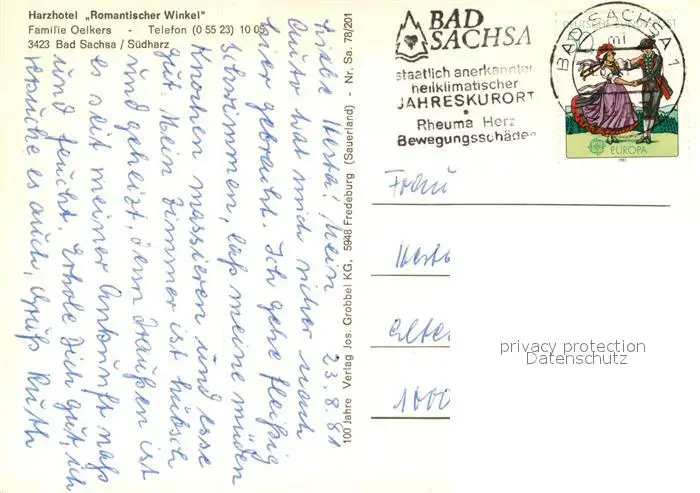 Bad_Sachsa_Harz Kategorie Alte Ansichtskarten Postkarten bx50321 Bad_Sachsa_Harz Harzhotel Romantischer Winkel Restaurant Hallenbad Bad_Sachsa_Harz postalisch gelaufen 1981 Erhaltung siehe scans [FriedD77]