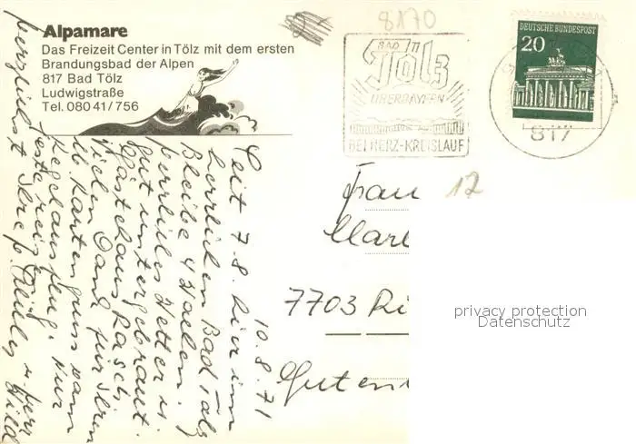 Bad_Toelz Alpamare Freizeit Center Brandungsfreibad Sprudelfreibad Jodtherme Bad_Toelz postalisch gelaufen 1971 Erhaltung siehe scans [LiesaD40] LiesID40