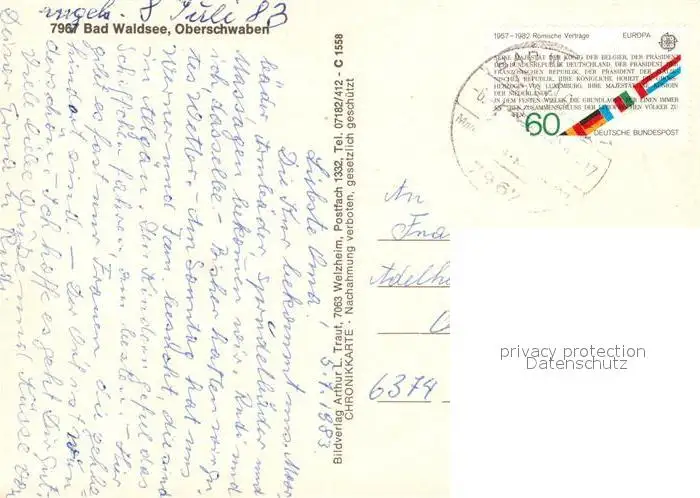 Bad_Waldsee Rathaus Wurzacher Torturm Wasserschloss Stadtsee Museum Masken Museum Wappenschilder Chronik Bad_Waldsee postalisch gelaufen 1983 Erhaltung siehe scans [FriedD77] Frierer
