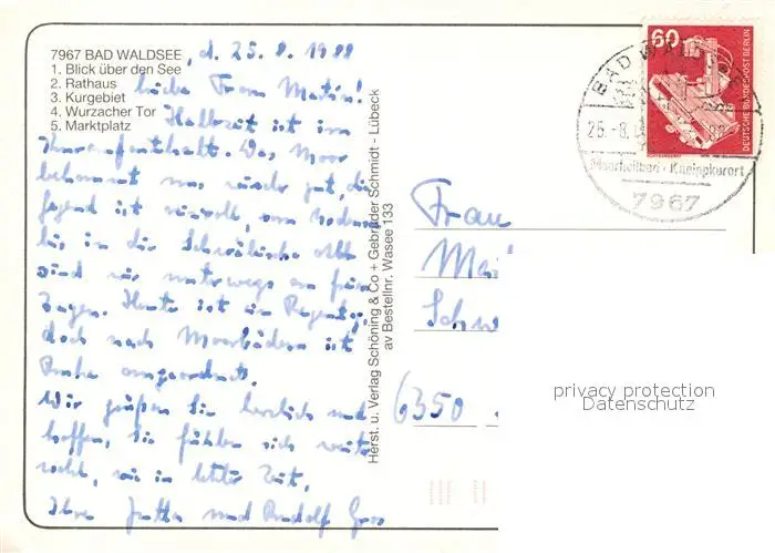Bad_Waldsee See Kurgebiet Wurzacher-Tor Marktplatz Bad_Waldsee postalisch gelaufen 1988 Erhaltung siehe scans [LiesaD40] LiesID40