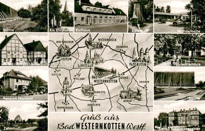 AK / Ansichtskarte Bad_Westernkotten Saline Ehrenmal Kurhaus Soleturm Wandelhalle Alte Fachwerkhaeuser Pension Markoni Zehnthof Kurmittelhaus Schloss Schwarzengraben Bad_Westernkotten
