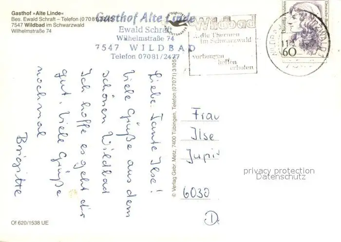 Bad_Wildbad Gasthof Alte Linde Restaurant Kaminzimmer Ortsansicht Schwarzwald Bad_Wildbad postalisch gelaufen nach 1965 Erhaltung siehe scans [FriedD77] Frierer