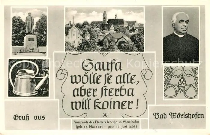 Bad_Woerishofen Kneippdenkmal und Portrait Panorama Giesskanne Bad_Woerishofen postalisch nicht gelaufen 1921-1965 Erhaltung siehe scans [WerneD78] WernPID7