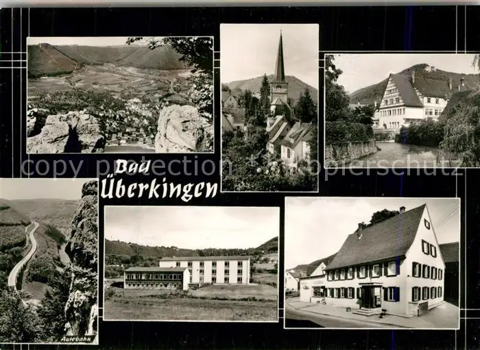 Bad_ueberkingen Panorama Kirche Partie am Fluss Hotelfachschule Autobahn Felsen Bromsilber Bad_ueberkingen postalisch nicht gelaufen 1921-1965 Erhaltung siehe scans [FriedD77] Frierer