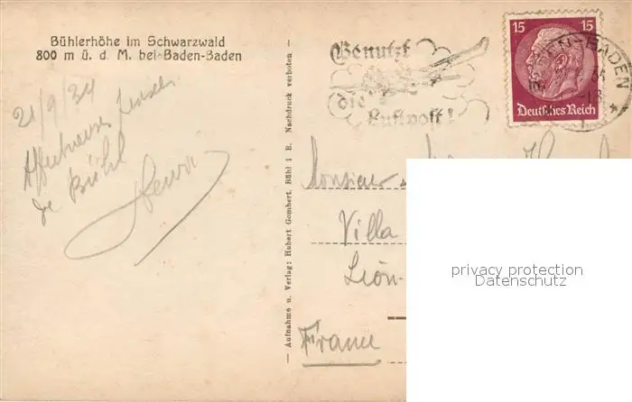 Baden-Baden Buehlerhoehe Baden-Baden postalisch gelaufen 1934 Erhaltung siehe scans [KathaD81] Kathoren