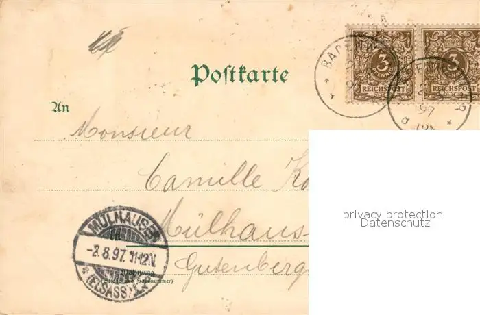 Badenweiler Kategorie Alte Ansichtskarten Postkarten bx88177 Badenweiler Parkanlagen Eingang Marmor Bad Hotel Sommer Badenweiler postalisch gelaufen 1897 Erhaltung siehe scans [WerneD78]
