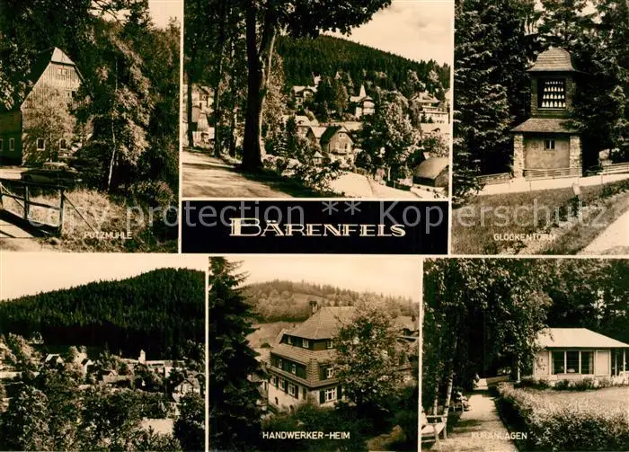 AK / Ansichtskarte Baerenfels_Erzgebirge Putzmuehle Glockenturm Kuranlagen Handwerkerheim Baerenfels Erzgebirge