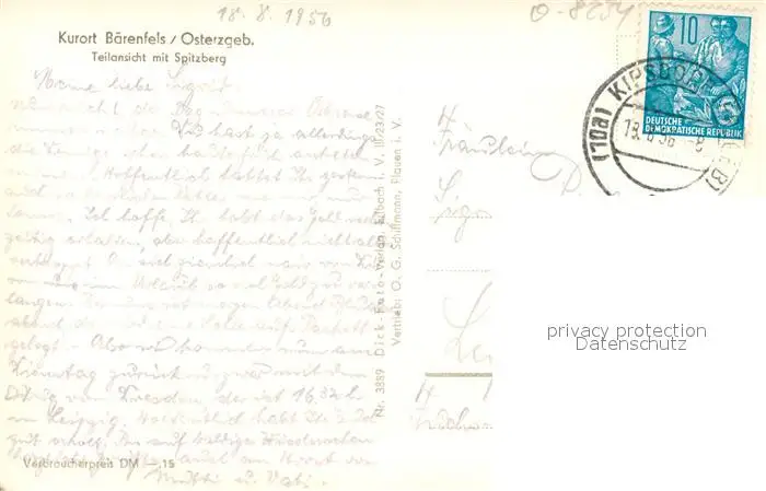 Baerenfels_Erzgebirge Teilansicht Kurort mit Spitzberg Baerenfels Erzgebirge postalisch gelaufen 1956 Erhaltung siehe scans [FriedD77] Frierer