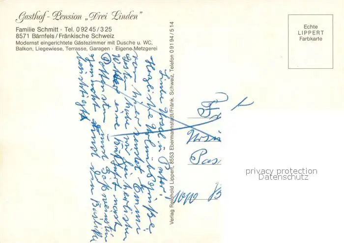 Baernfels Gasthof Pension Drei Linden Fraenkische Schweiz Baernfels postalisch nicht gelaufen nach 1965 Erhaltung siehe scans [FriedD77] Frierer