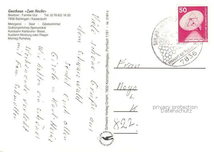 Bahlingen Gasthaus Zum Hecht Altbadischer Gasthof Bahlingen postalisch gelaufen nach 1965 Erhaltung siehe scans [FriedD77] Frierer