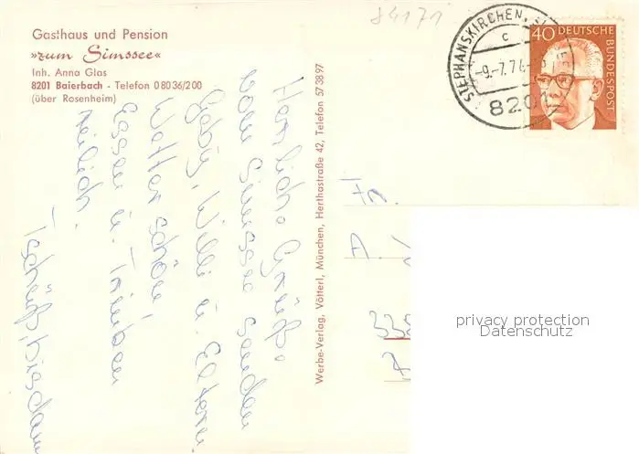 Baierbach_Rosenheim Gasthaus Pension zum Simssee Gastraum Garten Terrasse Baierbach Rosenheim postalisch gelaufen 1974 Erhaltung siehe scans [FriedD77] Frierer