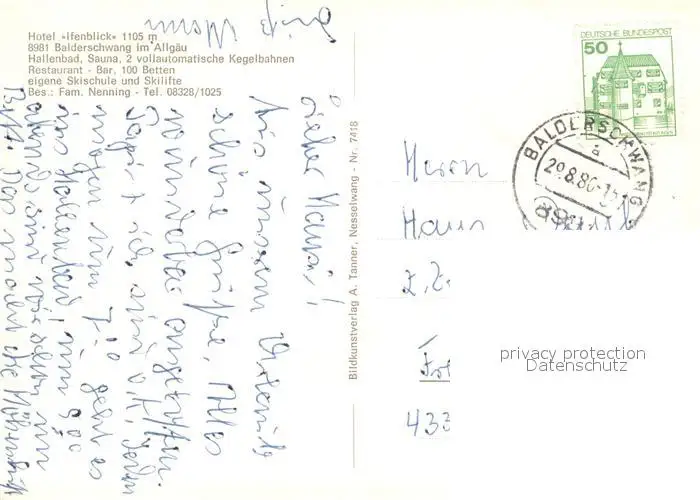 Balderschwang Hotel Ifenblick Restaurant Hallenbad Balderschwang postalisch gelaufen 1980 Erhaltung siehe scans [FriedD77] Frierer