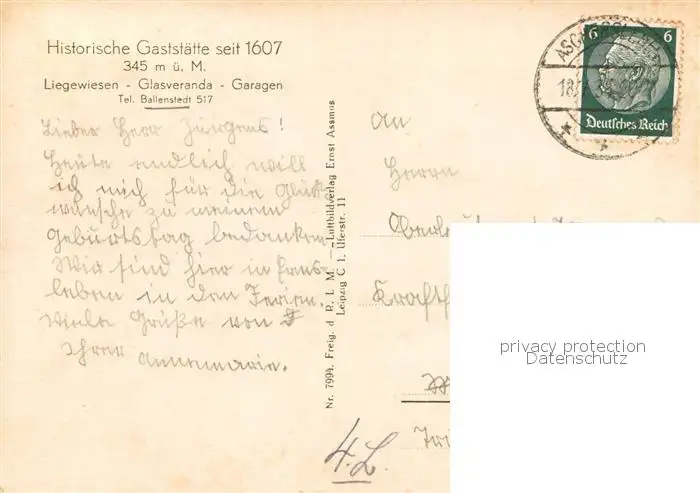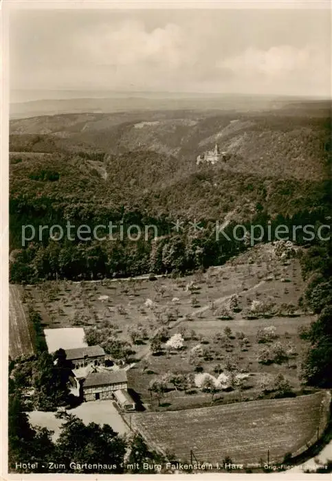 Ballenstedt Hotel zum Gartenhaus mit Burg Falkenstein Ballenstedt postalisch gelaufen 1935 Fliegeraufnahme Erhaltung siehe scans [FriedD77] Fliegeraufnahme Frierer