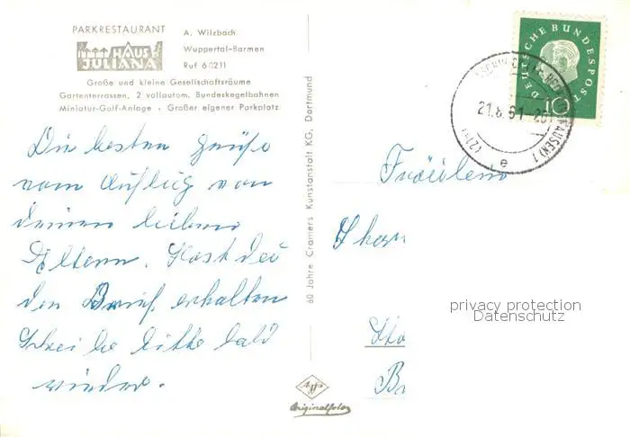Barmen_Wuppertal Parkrestaurant Haus Juliana Gartenterrasse Minigolf Barmen Wuppertal postalisch gelaufen 1961 Erhaltung siehe scans [FriedD77] Frierer