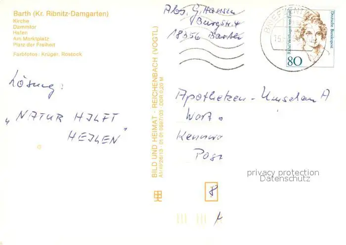 Barth Kirche Dammtor Hafen Marktplatz Platz der Freiheit Barth postalisch gelaufen 1990 Erhaltung siehe scans [FriedD77] Frierer