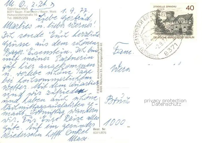 Bayerisch_Eisenstein Gaestehaus Mark Gaestezimmer Panorama Bayerisch_Eisenstein postalisch gelaufen 1977 Erhaltung siehe scans [WerneD78] WernPID7