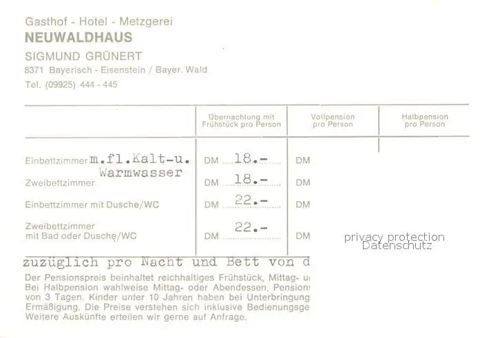Bayerisch_Eisenstein Gasthof Hotel Neuwaldhaus Restaurant Panorama Bayerisch_Eisenstein postalisch nicht gelaufen nach 1965 Werbekarte (keine Postkarte) Erhaltung siehe scans [FriedD77] Werbekarte (keine Postkarte) Frierer