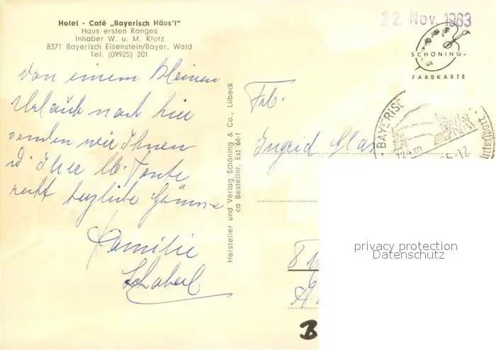 Bayerisch_Eisenstein Hotel Cafe Bayerisch Haeusl Bayerisch_Eisenstein postalisch gelaufen 1983 Erhaltung siehe scans [WerneD78] WernPID7