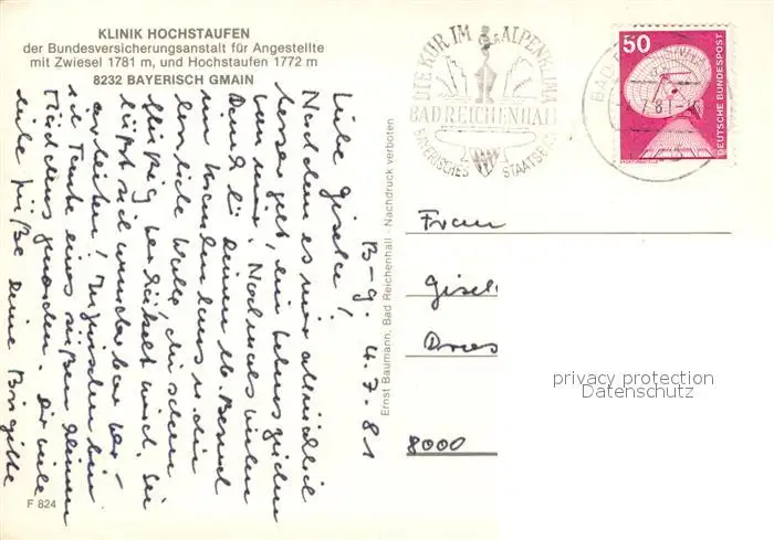 Bayerisch_Gmain Klinik Hochstaufen mit Zwiesel und Hochstaufen Alpen Bayerisch Gmain postalisch gelaufen 1981 Erhaltung siehe scans [FriedD77] Frierer