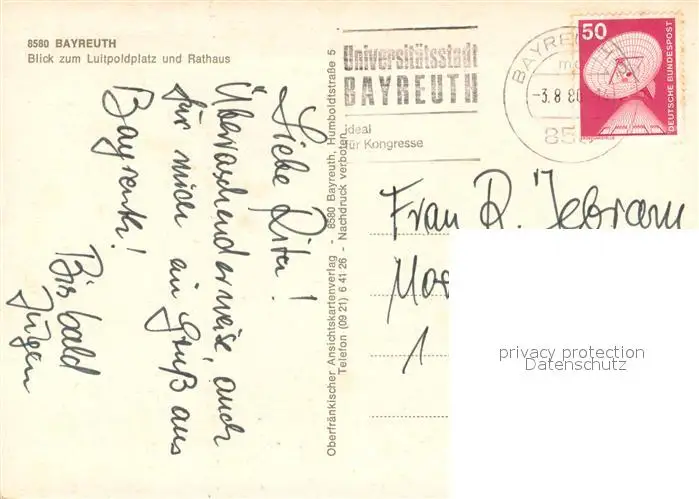 Bayreuth Luitpoldplatz und Rathaus Bayreuth postalisch gelaufen 1980 Erhaltung siehe scans [WerneD78] WernPID7