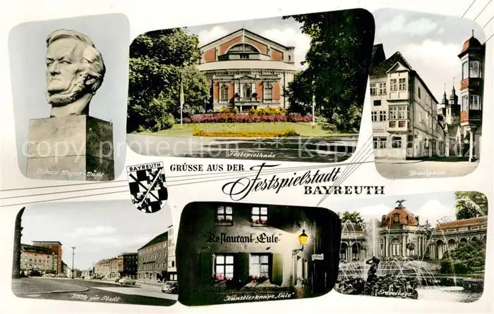 AK / Ansichtskarte Bayreuth Ortspartie Brautgasse Kuenstlerkneipe Eule Festspielhaus Bahnhofstr Wagner Bueste Eremitage Bayreuth