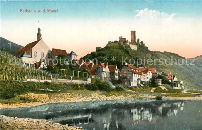 Beilstein_Mosel Partie an der Mosel Kirche Burgruine Beilstein_Mosel postalisch nicht gelaufen 1921-1965 Erhaltung siehe scans [FriedD77] Frierer