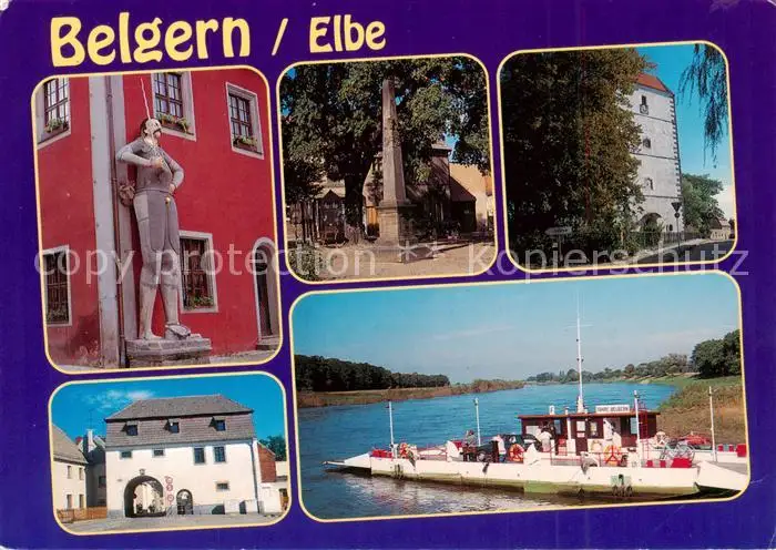 AK / Ansichtskarte Belgern_Elbe Roland Postmeilensaeule Stadttor Faehre Belgern Elbe