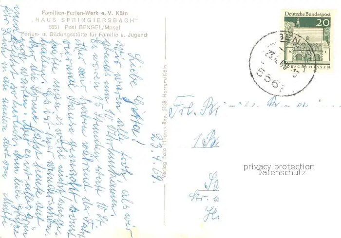 Bengel Familien Ferienwerk Koeln Haus Springiersbach Kirche Bengel postalisch gelaufen 1968 Erhaltung siehe scans [WerneD78] WernPID7